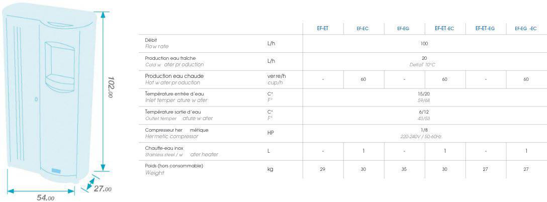 • Système à banc de glace d’une grande autonomie (0,75kg de glace) permettant de servir jusqu’à 50 gobelets d’eau parfaitement rafraichie. Son échangeur Cuivre permet d’en limiter les risques de colonisation bactériologique.